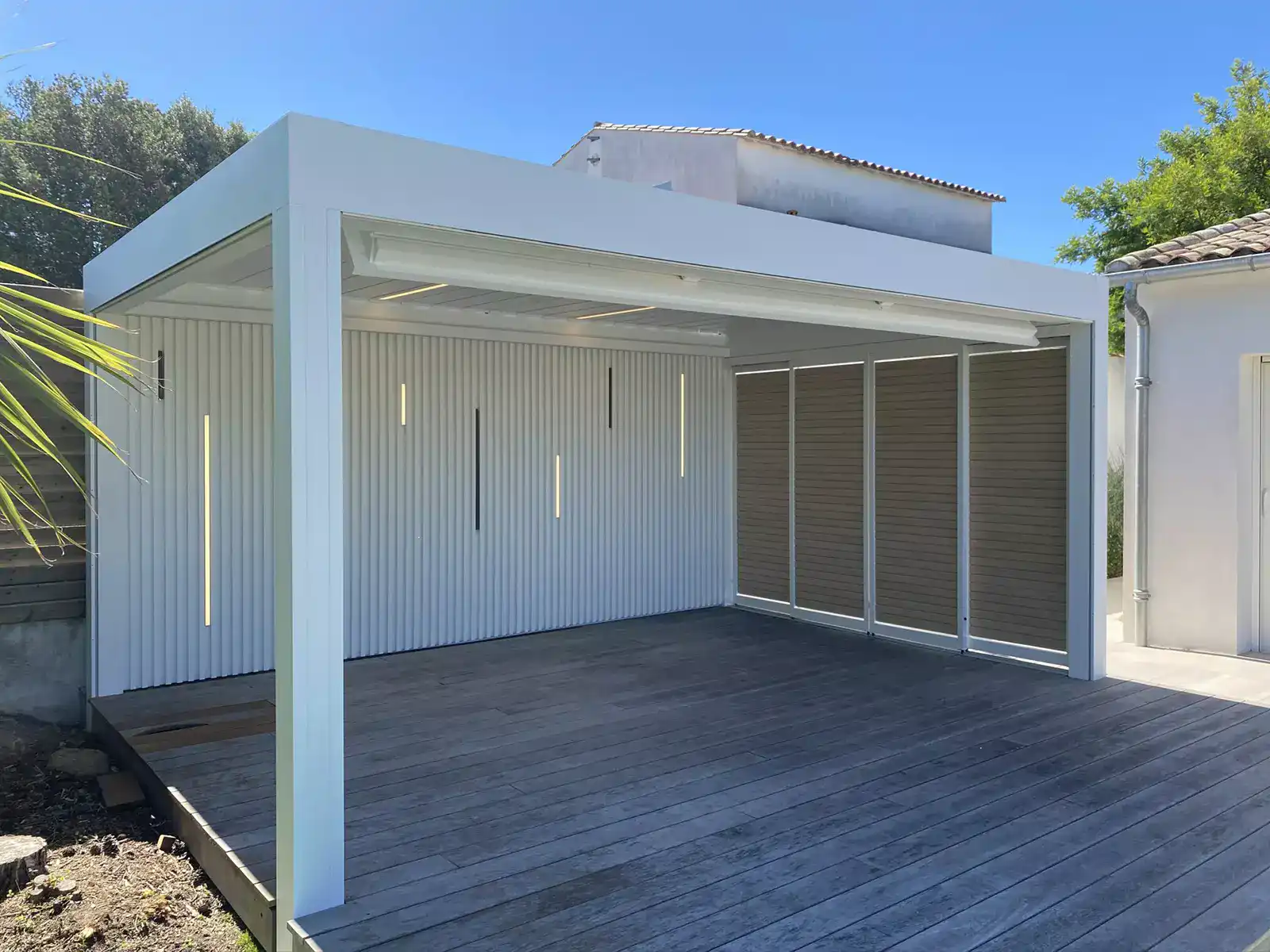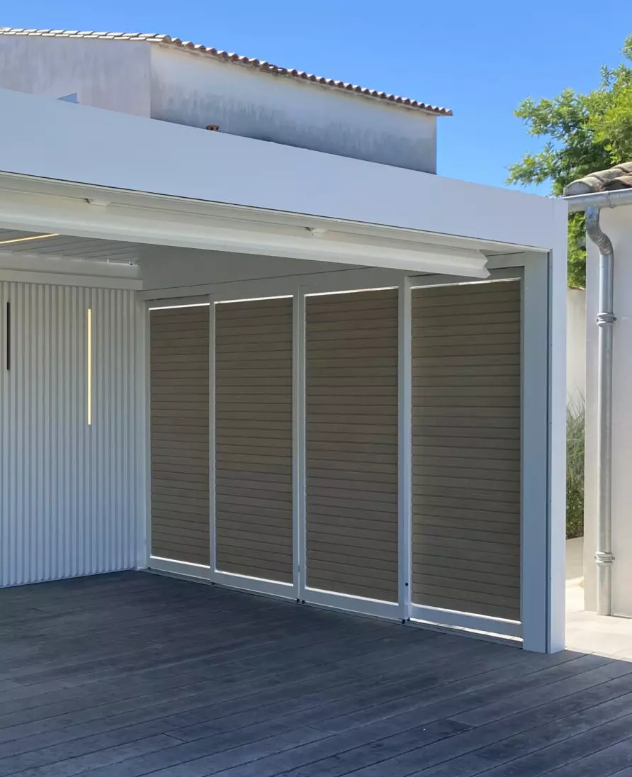 Travaux réalisés : Pergola bioclimatique avec stores verticaux et panneaux latéraux.